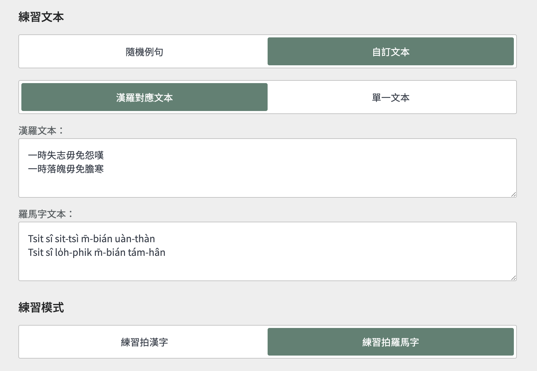 練習文本若揀「單一文本」,就毋免設定漢羅對應的文章,任何的文章攏通好擲入去練習。