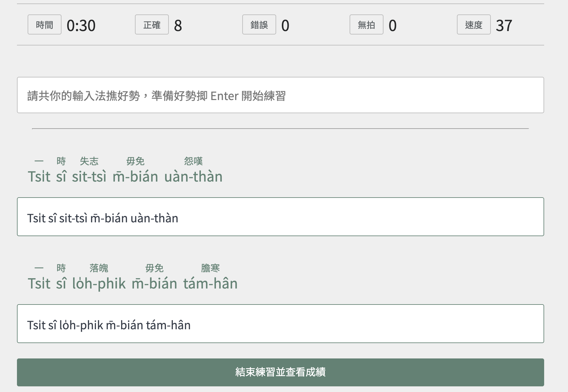 入去練習畫面了後,你會使先佇頭一逝文字框共你的輸入法撨好勢,揤 Enter 就會自動跳去頭一句開始算時間。你若拍字系統嘛會若標注你的輸入有正確抑無。