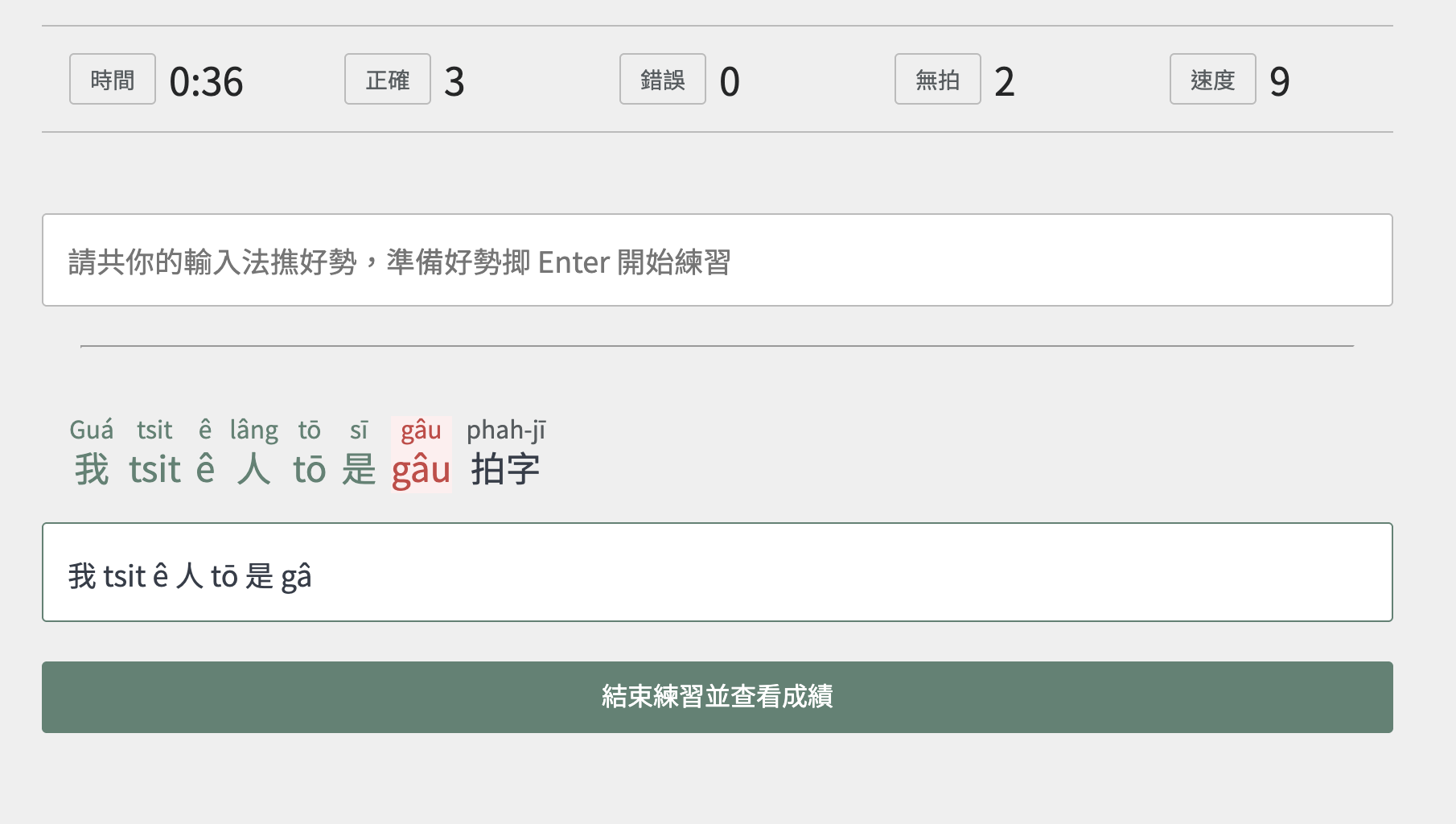 練習完成了後,系統會顯示你的成績。標點符號佇咧回答的時陣會標示有正確抑無,毋過袂算入去成績,干焦會算你每分鐘拍幾个音節。