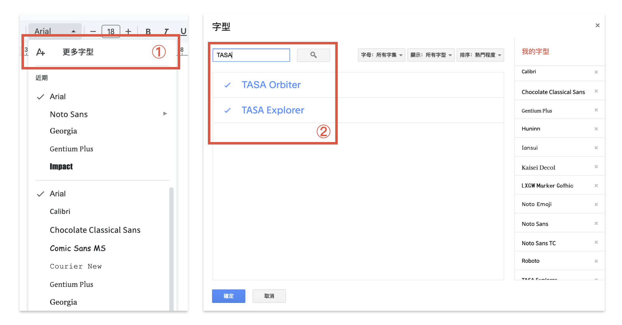 Tī Google ê hûn-tuan nńg-thé tshi̍h "更多字型", tshuē "TASA" tō tshuē ē tio̍h tsit nn̄g thò jī-hîng, lóng kā kau--khí-lâi tō ē-tàng tī jīm-hô Google ê nńg-thé lāi-té sú-iōng--ah. Ē-tàng hōo lí ê Google pio-tuann tsìng-siông hián-sī lô-má-jī, mā ē-tàng tsò tâu-iánn-phìnn tíng-tíng ê iōng-tôo.